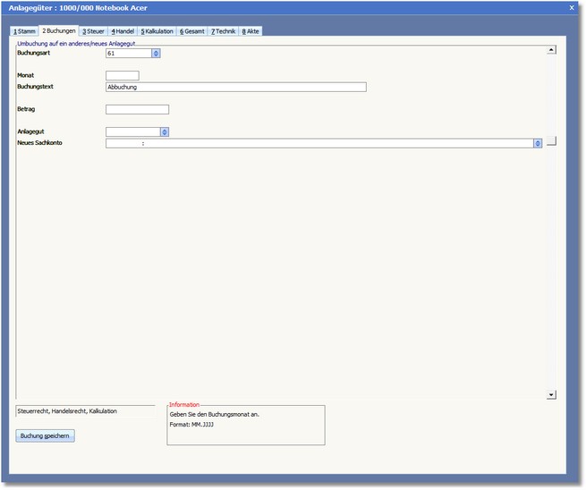 Eingetragen wird der Zeitpunkt in Form vom Monat.Jahr [MM.JJJJ] ab dem die Umbuchung für das gewählte Anlagegut erfolgen soll.