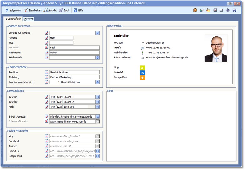 Hier werden die gespeicherten Daten des Ansprechpartners in Visitenkartenform dargestellt.