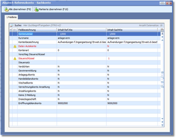 Mit [F9] werden alle farblich gekennzeichneten Inhalte vom Referenzkonto in das Sachkonto übertragen.