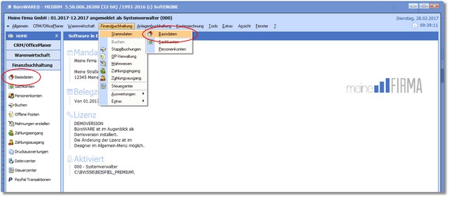 1. Klicken Sie mit der Maus im Hauptmenü auf "Finanzbuchhaltung > Stammdaten > Basisdaten".