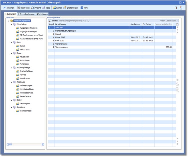 Je nach Baumauswahl werden in der Tabelle die zugehörigen Buchungsstapel angezeigt. Markieren Sie den gewünschten Buchungsstapel und drücken Sie [RETURN], um in die Buchungserfassung zu gelangen.