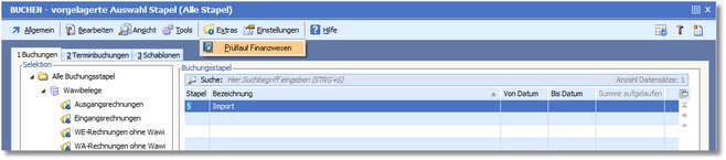 | 2. | Klicken Sie mit der Maus auf den Menüpunkt "Extras > Prüflauf Finanzwesen". |