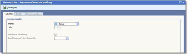 Der Dialog zur Erstellung der Z-Meldung wird zunächst mit der Karteikarte "Selektion" geöffnet.