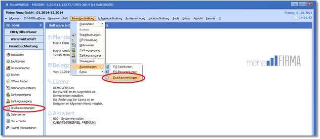 1. Klicken Sie mit der Maus im Hauptmenü auf „Finanzbuchhaltung > Auswertungen > Druckauswertungen"