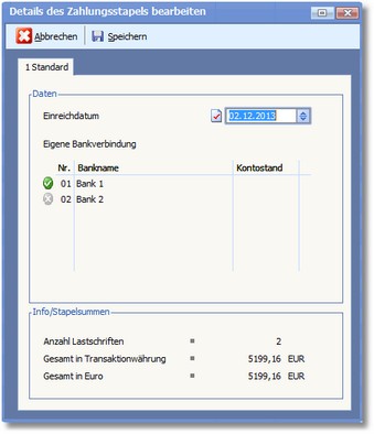 Mit [F9] werden die Zahlungsstapel anschließend an die Bank übertragen und in die Karteikarte "2 An Bank übergeben/übertragen" verschoben.