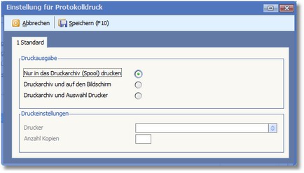 Einstellungen für Protokolldruck Hier können Sie festlegen, ob der Druck ausschließlich in den Spool und/oder auf dem Bildschirm bzw. auf einem Drucker erfolgen soll. Wenn eine Druckausgabe auf Papier gewünscht wird, ist im Feld DRUCKER der Drucker einzutragen, auf dem der Druck erfolgen soll. Weiterhin kann hier auch die Anzahl der auszugebenden Kopien eingetragen werden.