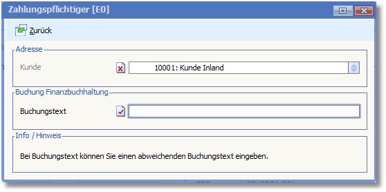 Hier können Sie einen individuellen Buchungstext eingeben, der nach erfolgter Buchung in der Finanzbuchhaltung angezeigt wird.