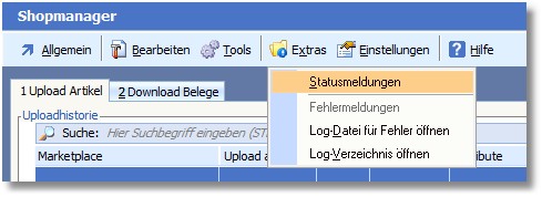 Über den Menüpunkt "Extras > Statusmeldungen" kann der Upload der Statusmeldungen manuell angestoßen werden.
