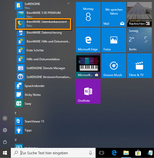 Sie finden den Datenbankassistent im SoftENGINE-Startmenü oder starten ihn direkt aus dem BüroWARE-Verzeichnis.