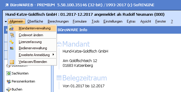 Nach dem Menüwechsel können Sie den Menüpunkt "Mandantenverwaltung" im Menü "Allgemein" öffnen.