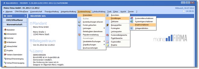 1. Klicken Sie mit der Maus im Hauptmenü auf "Kostenrechnung > Stammdaten > Einstellungen > Projektschablonen".