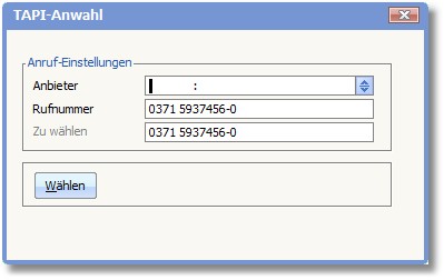 Es wird ein Dialog geöffnet, in dem die Rufnummer des Adressaten steht und in dem Sie einen Telefonanbieter für die Verbindung auswählen können. Standardmäßig wird der Telefonanbieter vorgeschlagen, den Sie der jeweiligen Adresse zugeordnet haben (Adressstammdaten). Wenn Sie dort keinen Anbieter eingetragen haben, wird der Telefonanbieter vorgeschlagen, den Sie als Hauptanbieter festgelegt haben. Bei Anwahl über die Tastenkombination [STRG]+[SHIFT]+[Y] wird direkt gewählt!