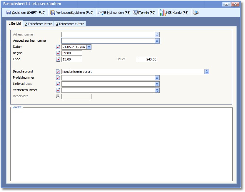 In der Terminbearbeitung können Sie über den Menüeintrag "Extras > Besuchsbericht verfassen" Details zum Termin sowie zu den Teilnehmern hinterlegen.
