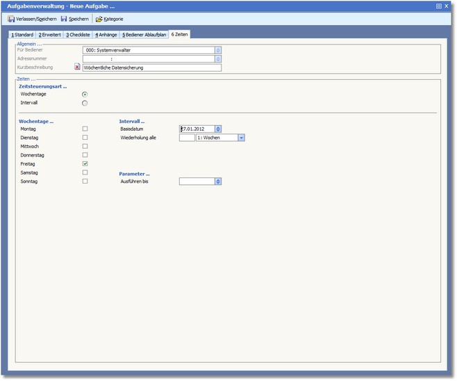 Legen Sie in diesem Bereich mit Auswahl der entsprechenden Option fest, ob die Aufgabe jeweils an einem bestimmten Wochentag oder in regelmäßigen Intervallen ausgeführt werden soll.