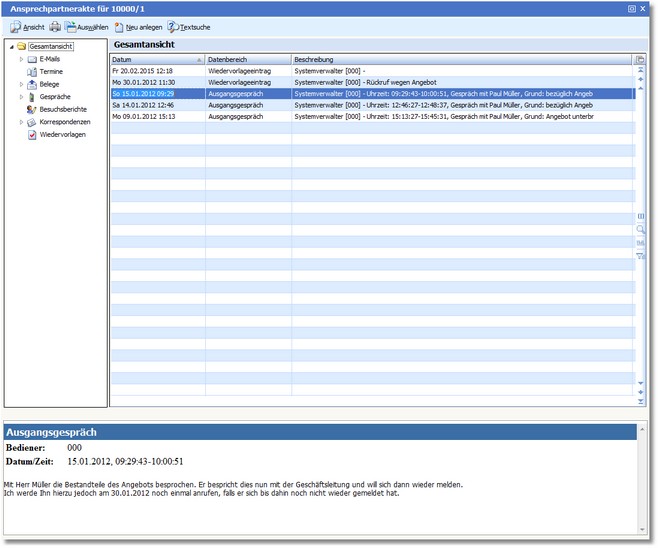 Mit [RETURN] oder einem Doppelklick auf einen Eintrag in der Tabelle können Sie den jeweiligen Bearbeitungsdialog (z.B. Mailerfassung, Belegbearbeitung, Vertragsbearbeitung usw.) aufgerufen.