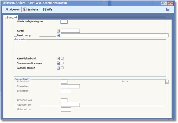 << Hier KLicken um eine Inhaltsübersicht anzuzeigen >> Navigation: OfficePlaner > Wiedervorlagen > Wiedervorlage - Menüleiste > CRM/Vertriebssteuerung > WVL-Kategorienstamm > WVL-Kategorien bearbeiten > Der Dialog "Erfassen/Ändern - CRM-WVL-Kategorienstamm" |