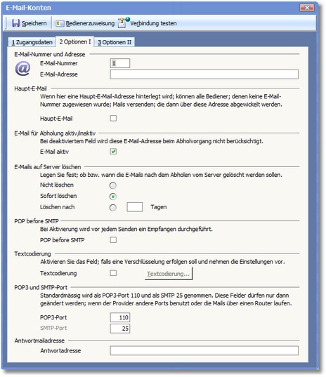 Das Kontrollfeld legt fest, ob die oben eingetragene E-Mail-Adresse die Haupt-E-Mail-Adresse ist. Falls einem der Bediener keine E-Mail-Adresse zugeordnet wird, werden ausgehende E-Mails dieses Bedieners über die Haupt-E-Mail-Adresse versendet, falls keine Haupt-E-Mail hinterlegt ist, hat der Bediener keine Möglichkeit, E-Mails zu versenden.