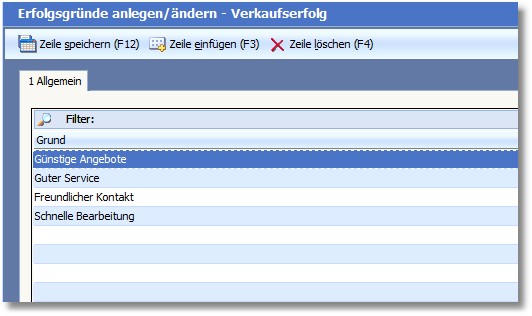 Erfolgsgründe werden zur exakten Auswertung des Verkaufserfolgs benötigt. Wenn z.B. ein Auftrag erzielt wurde, kann bei diesem der Erfolgsgrund hinterlegt werden.