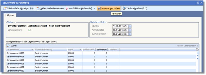 Anschließend können Sie die verbuchte Zählliste in der Inventurbuchungsliste einsehen.