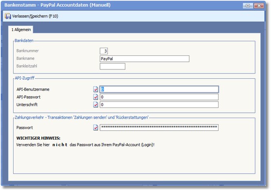<< Hier KLicken um eine Inhaltsübersicht anzuzeigen >> Navigation: Warenwirtschaft > Stammdaten > Basisdaten > Banken > Die Karteikarte "Standard" > Online Banking (PayPal) |