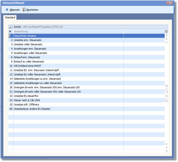 Alle bereits vorhandenen Steuerschlüssel werden in einer Auswahltabelle angezeigt. Ein Doppelklick mit der Maus oder [RETURN] auf einem Steuerschlüssel öffnet die Eingabemaske, in der Sie Steuerschlüssel anlegen oder ändern können.