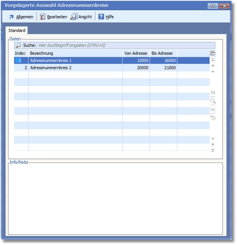 Das Programm öffnet die vorgelagerte Auswahltabelle der Adressnummernkreise.