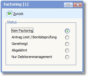 Hier wird der Factoringstatus festgelegt. Durch Aktivierung des entsprechenden Radiobuttons können Sie den entsprechenden Status der Adresse auswählen.