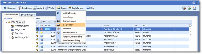 1. Klicken Sie mit der Maus im Adresstamm auf "Extras > Zielgruppen".
