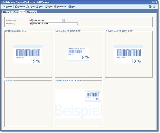 Sie haben die Möglichkeit, einem Artikel Bilder zuzuordnen, welche in Tabellen und Belegen angezeigt werden. Bilder können auch zur Anzeige in Shops genutzt werden.