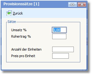 Innerhalb des Provisionssatzes ist definiert, dass 10% vom Umsatz provisioniert werden und eine Mengenprovision von 5 Einheiten zu je 2 Euro gilt.
