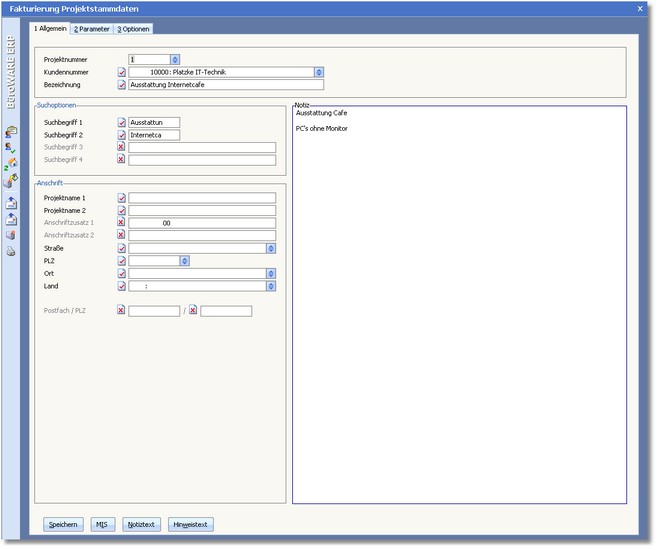 Jedes Projekt wird durch einen eindeutigen Schlüssel innerhalb der Warenwirtschaft identifiziert. Der Schlüssel kann zwischen 1 und 99999999 frei vergeben werden. Die Projektnummer bildet das Such- und Ordnungskriterium der Projektdaten.