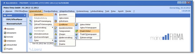 1. Klicken Sie mit der Maus im Hauptmenü auf "Warenwirtschaft > Stammdaten > Konditionen > Projekt/Artikel".