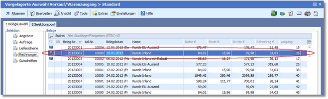5. Um einen im Belegboard angezeigten Beleg wieder zu bearbeiten, wählen Sie den zutreffenden Beleg aus und drücken [RETURN] oder klicken auf den Symbolbutton <Bearbeiten>. Das Programm öffnet die Positionserfassung des ausgewählten Beleges.