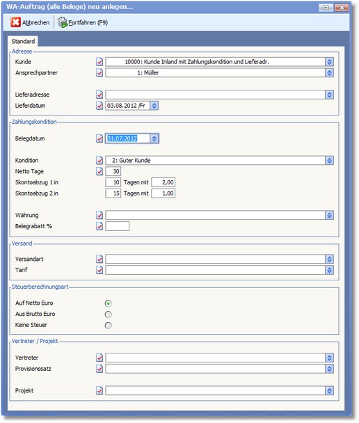 Die Steuerberechnung ist von besonderer Bedeutung und sollte schon im Adressstamm entsprechend korrekt hinterlegt sein. Vorgeschlagen wird auch hier die Kennziffer, die beim Kunden bzw. Lieferanten hinterlegt ist. Ein nachträgliches Ändern der Steuerberechnungsart ist nicht möglich.