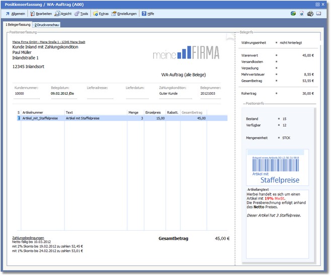 - der Preis ist ein Bruttopreis (einschließlich Mehrwertsteuer), wenn für den Beleg die Steuerberechnungsart 4 eingestellt wurde.