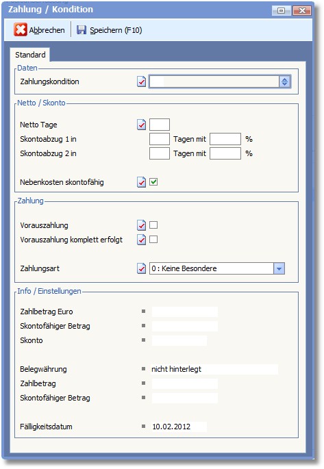 Hier können Sie abweichende Zahlungskonditionen für den Beleg hinterlegen. Sind hier keine Einstellungen hinterlegt, werden die in den Stammdaten des Lieferanten hinterlegten Zahlungskonditionen verwendet.