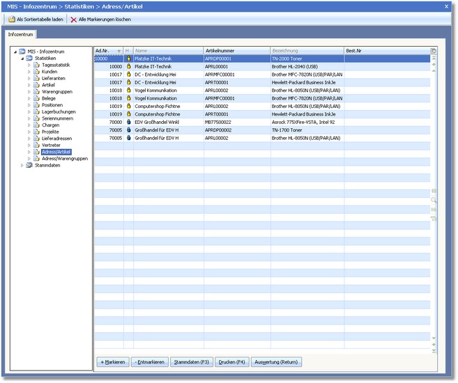 << Hier KLicken um eine Inhaltsübersicht anzuzeigen >> Navigation: Warenwirtschaft > Auswertungen > Informationszentrum > MIS-Infozentrum > Adress / Artikel |