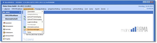 1. Klicken Sie mit der Maus im Hauptmenü auf "Warenwirtschaft > Auswertungen > Druckauswertungen".