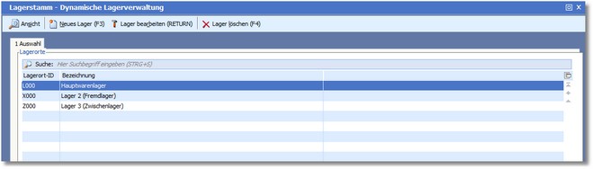 In der vorgelagerten Auswahltabelle werden die bereits angelegten Lager angezeigt. In dieser Tabelle sind die bereits beschriebenen Such- und Sortierfunktionen aktiv.