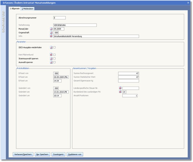 Auf jeden Fall muss ein innergemeinschaftlicher Warenverkehr spätestens im darauf folgenden Monat statistisch angemeldet werden, auch wenn sich die Rechnungsstellung bzw. der Rechnungseingang weiter verzögert. Im Beleg können Sie sowohl den Berichtsmonat als auch die Meldungseinstellung belegbezogen ändern. |