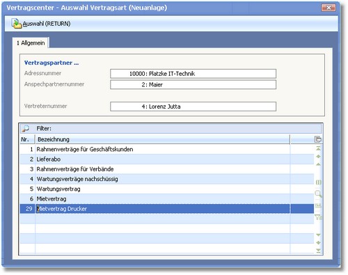 Sie wählen für unser Beispiel als Ansprechpartner "2 Torsten Maier" und bestätigen dies mit [RETURN].