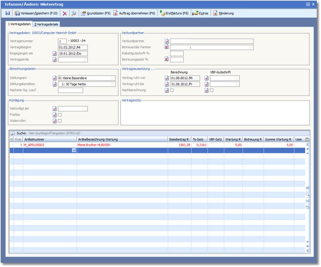 Der Bereich "Vertragsdaten: 10003/Computer Heinrich GmbH“