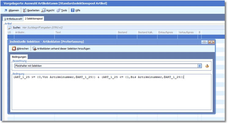 Es soll über einem Platzhalter eine Selektion aufgebaut werden, in der Von/Bis Artikelnummer selektiert werden soll.