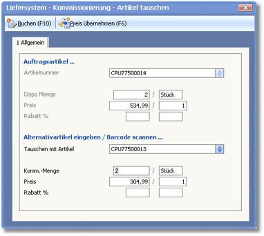 Mit Hilfe dieses Dialogs können Sie Artikel tauschen. Dies ist immer dann sinnvoll, wenn der vom Kunden gewünschte Artikel nicht vorrätig ist und ein gleichwertiger Artikel (Ersatz-/Alternativartikel) geliefert werden soll.