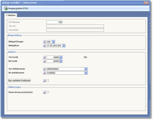 3. Grenzen Sie die Belege, deren Artikel zur Lieferung vorgeschlagen werden sollen, mittels folgender Selektionsparameter ein:
