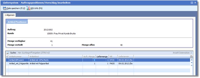 Das Programm öffnet den Dialog "Liefersystem - Auftragspositionen/Vorschlag bearbeiten".